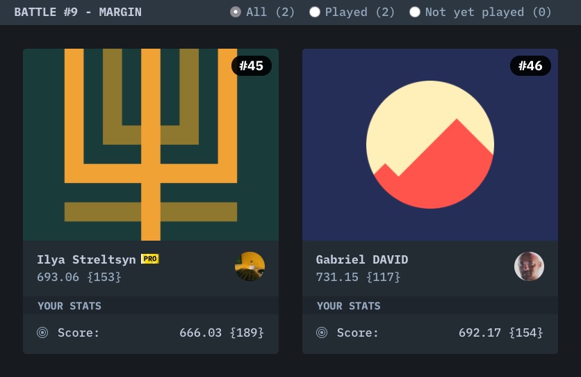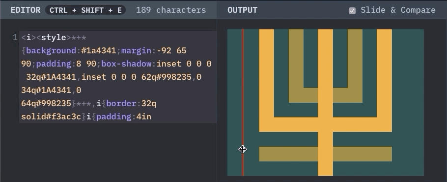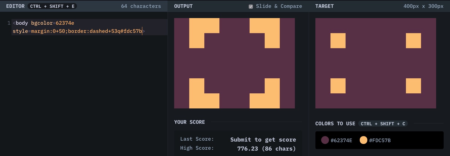 在 CSSBattle 的 spectrum 讨论里看到有人说,battle 得分是基于代码字符多少的,这样鼓励了我们去写一些奇技淫巧,去写一些难以阅读的代码。甚至有人为了使用某些特性,使用 1% 的浏览器。